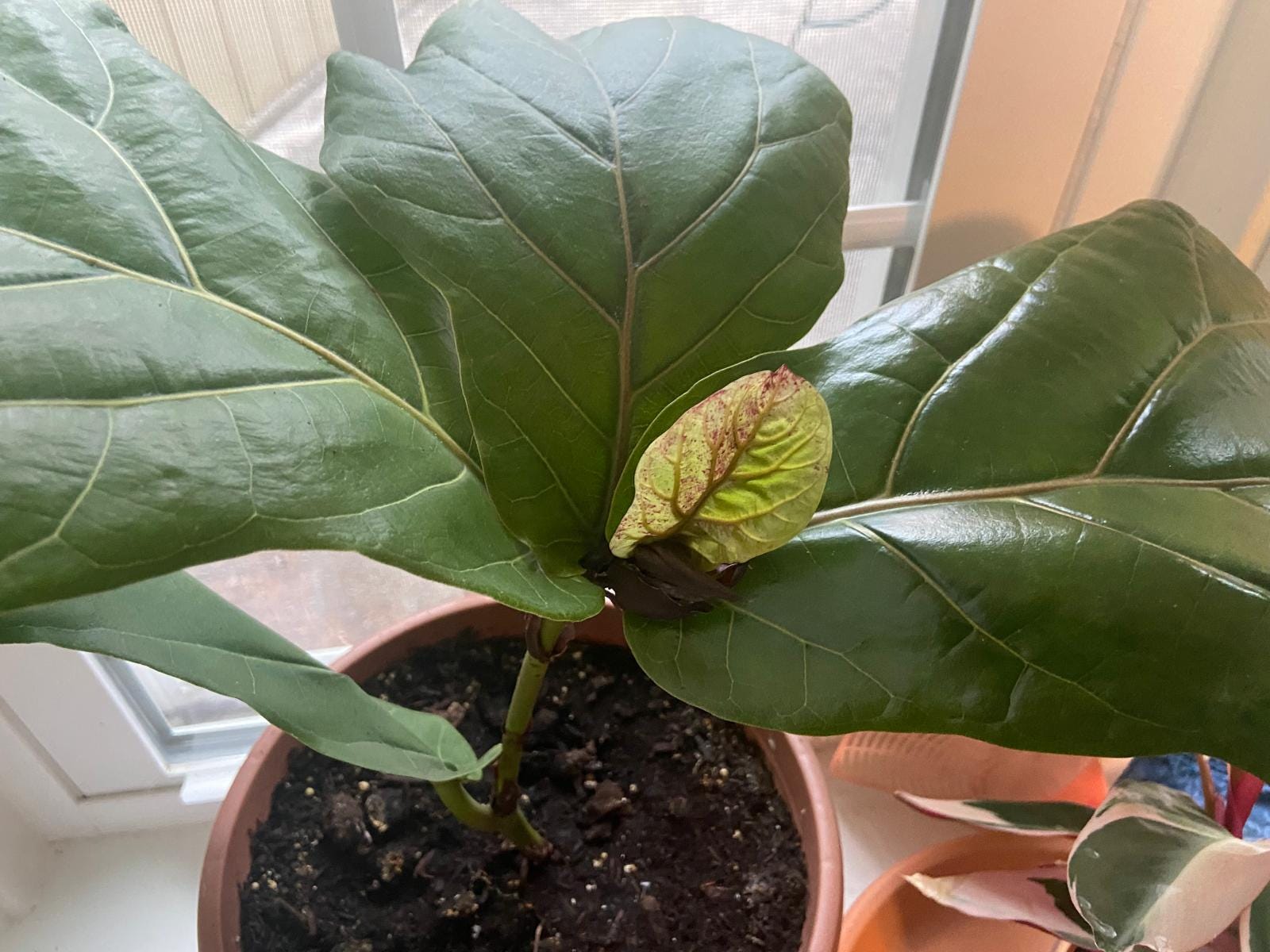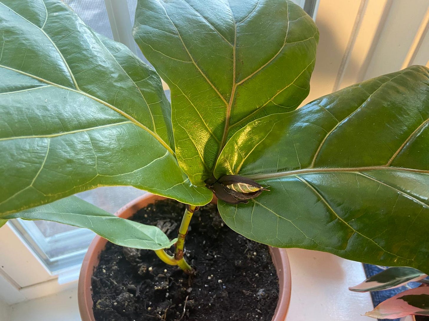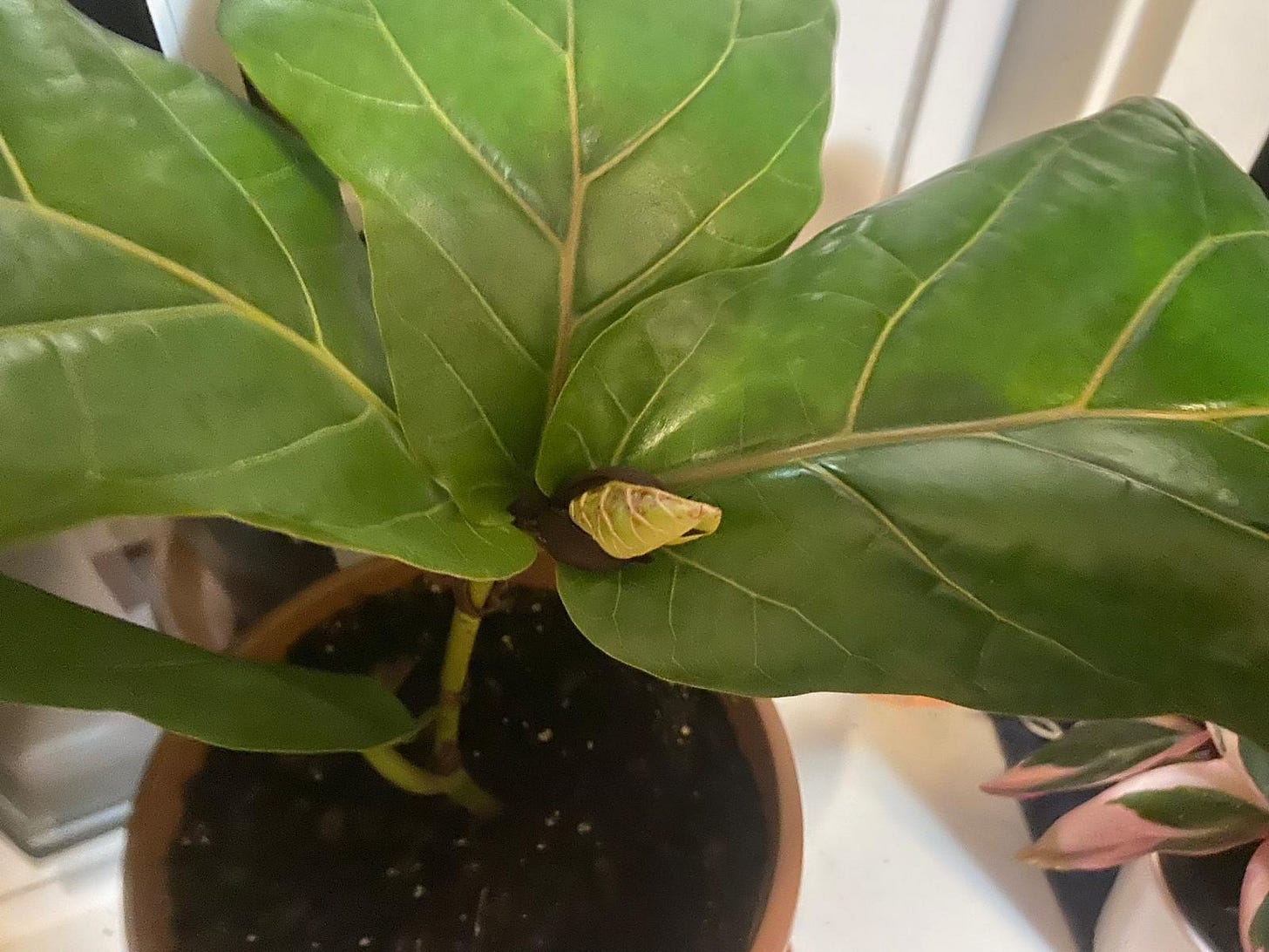 Three large mature leaves are seen in the first photo. They are a glossy dark-green, a forest green. Their perimeters slightly curve away from the off-white main vein connecting each leaf’s stem to its outermost tip. And off that are smaller veins branching gently upward toward the perimeters, and even smaller veins branching off those. The stem of the newest leaf appears to attach to that of the mature leaf it lies on—how minute it must be. By the third and final photograph of the newest leaf’s growth, I discovered that my response, rather than being only to the horticulture of the plant, was my maternal awareness for how the newest leaf, while dependent on its attachment to the main stem, was asserting itself on its journey to maturity.