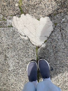In mid-April 2025, after a seven-and-a-half-month pilgrimage to Meherabad,* I returned home to Washington State in the US, where I have resided for four-and-a-half years. Initially grateful to no longer need a car, I have only walked here, enjoying my strolls through the nearby neighborhoods and delighted by the continuous scattering of buttons of yellow flowers growing in the grass between the sidewalk and the boulevard. This past summer’s walks, however, offered me a new kind of enjoyment. It was on my daily excursions south to the mail shipping store, and north by the large regional library and four short blocks of stores, that I found hearts on the sidewalk.